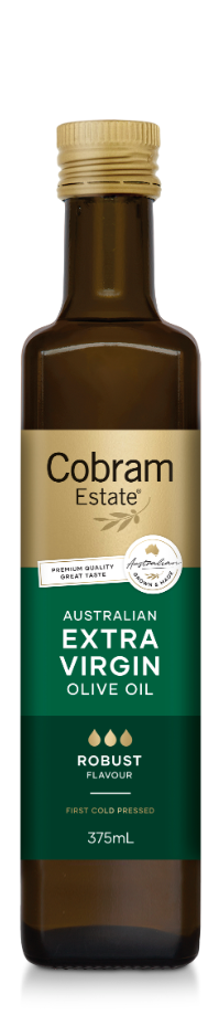 The Cobram Estate Robust Extra Virgin Olive Oil is typically a blend of Koroneiki, a variety of olives originating in Greece, & Coratina, which originates from Italy. These varieties produce a particularly bold, robust-favoured oil with notes of freshly cut grass. They typically have a high polyphenol count, lending to a pronounced bitterness and pungency.